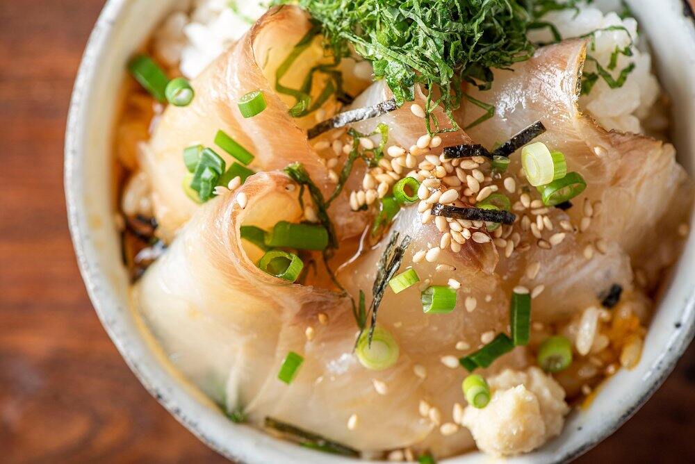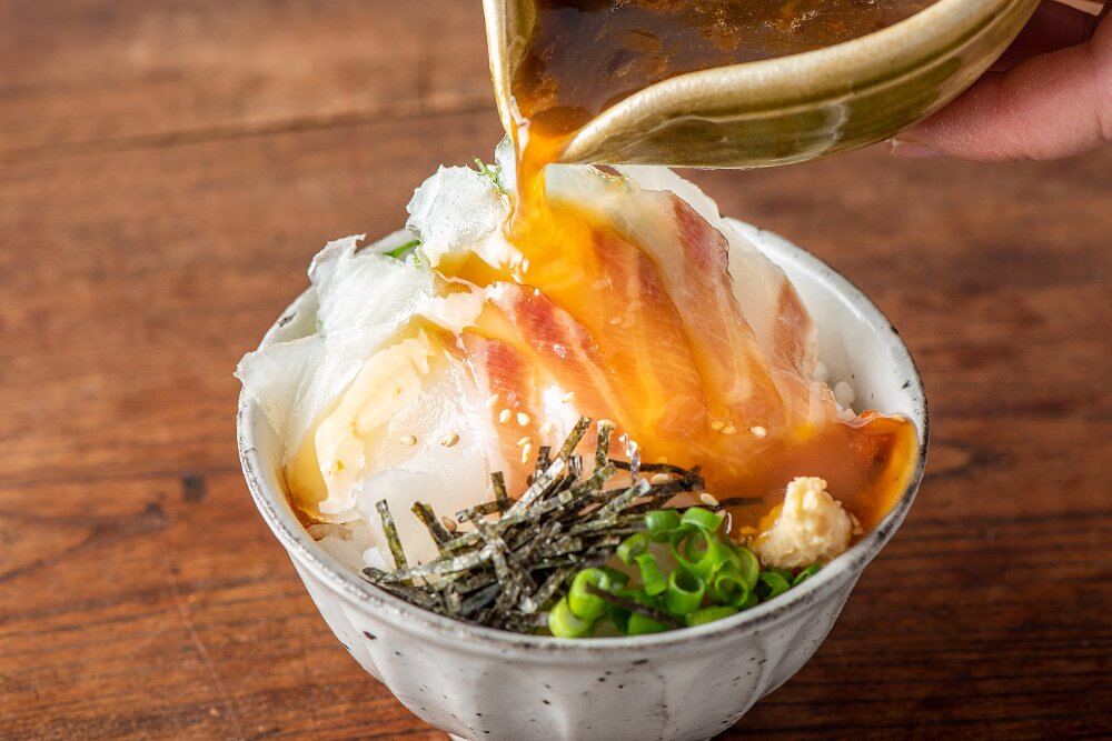 宇和海の日振島を根拠地にしていた伊予水軍が仲間たちと船の上で魚の刺身と茶碗酒で酒盛りした後、その酒の残った茶碗にご飯をつぎ、たっぷり醤油を含ませた刺身をのせ混ぜ合わせて食べたのが始まりとされ漁師たちに脈々と受け継がれてきました。